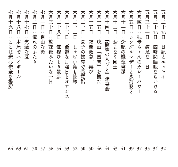 カルガモ/パン/かき氷/散歩/文芸誌『随風』/エッセイアンソロジー/東葛スポーツ/本の雑誌社/独歩ちゃんのカレー/シングルマザー/しらい弁当さん/読書会/北杜夫『楡家の人びと』/ゴールデン街/歯医者/第三の新人/ヤンヤン夏の想い出/代々木八幡宮/氷河期世代/四十代/仕事/映画『国宝』/独立系書店/ZINE/エッセイと日記/高校生男子/しゃけ小島/代田橋/下北沢/西荻窪/高円寺/高校野球/京王線/コジコジ/オアシス/阿波踊り/キャンティ/缶チューハイ/玉川上水/甲州街道/水道道路